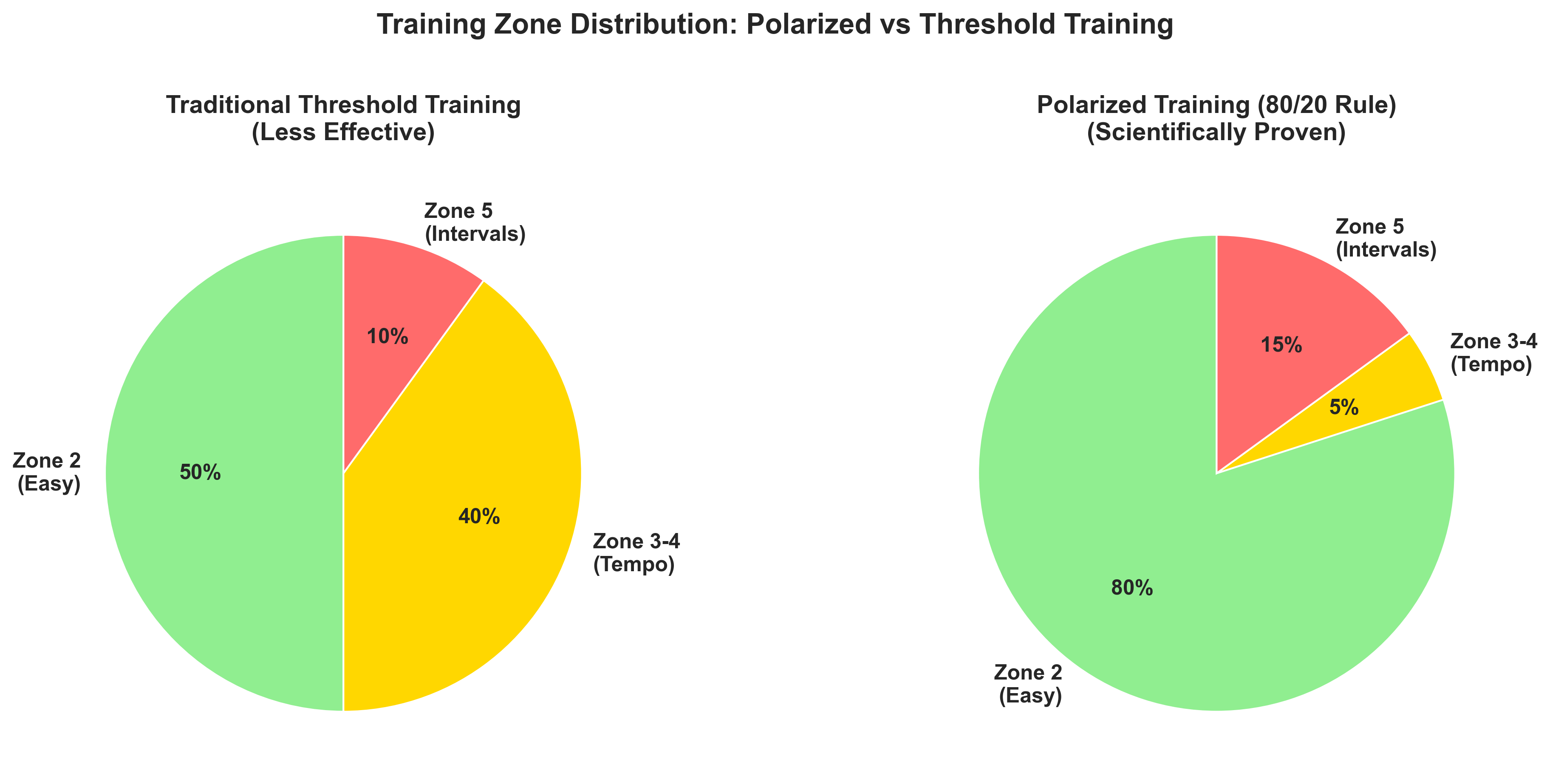 This directly contradicts traditional threshold training, where athletes spend 40-50% of their time at moderate intensity. Research consistently shows polarized training produces superior results.