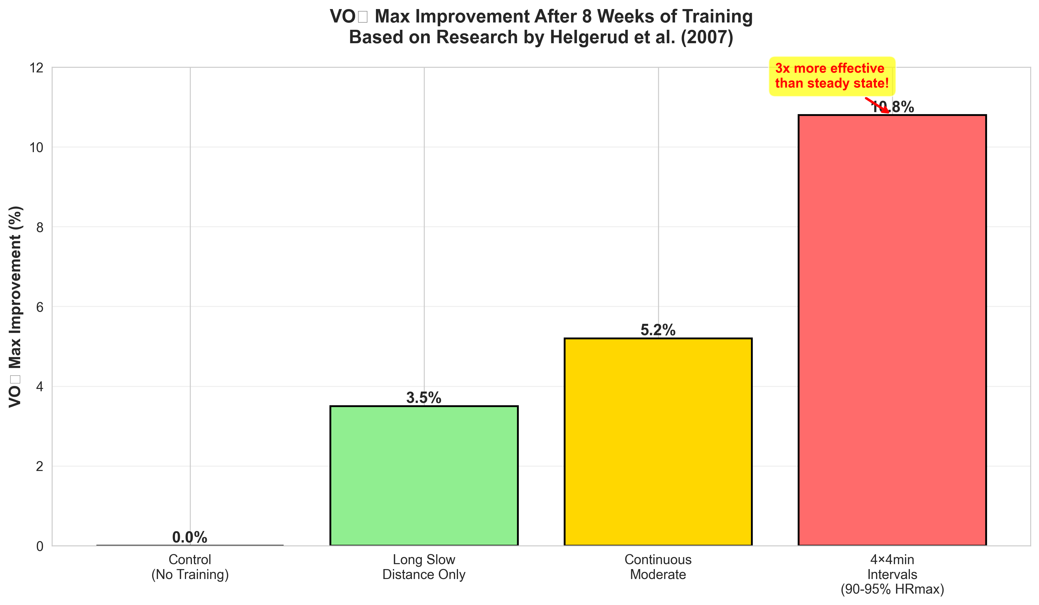 Research shows 4×4 minute intervals produce 3x greater VO₂ max improvements than steady-state training