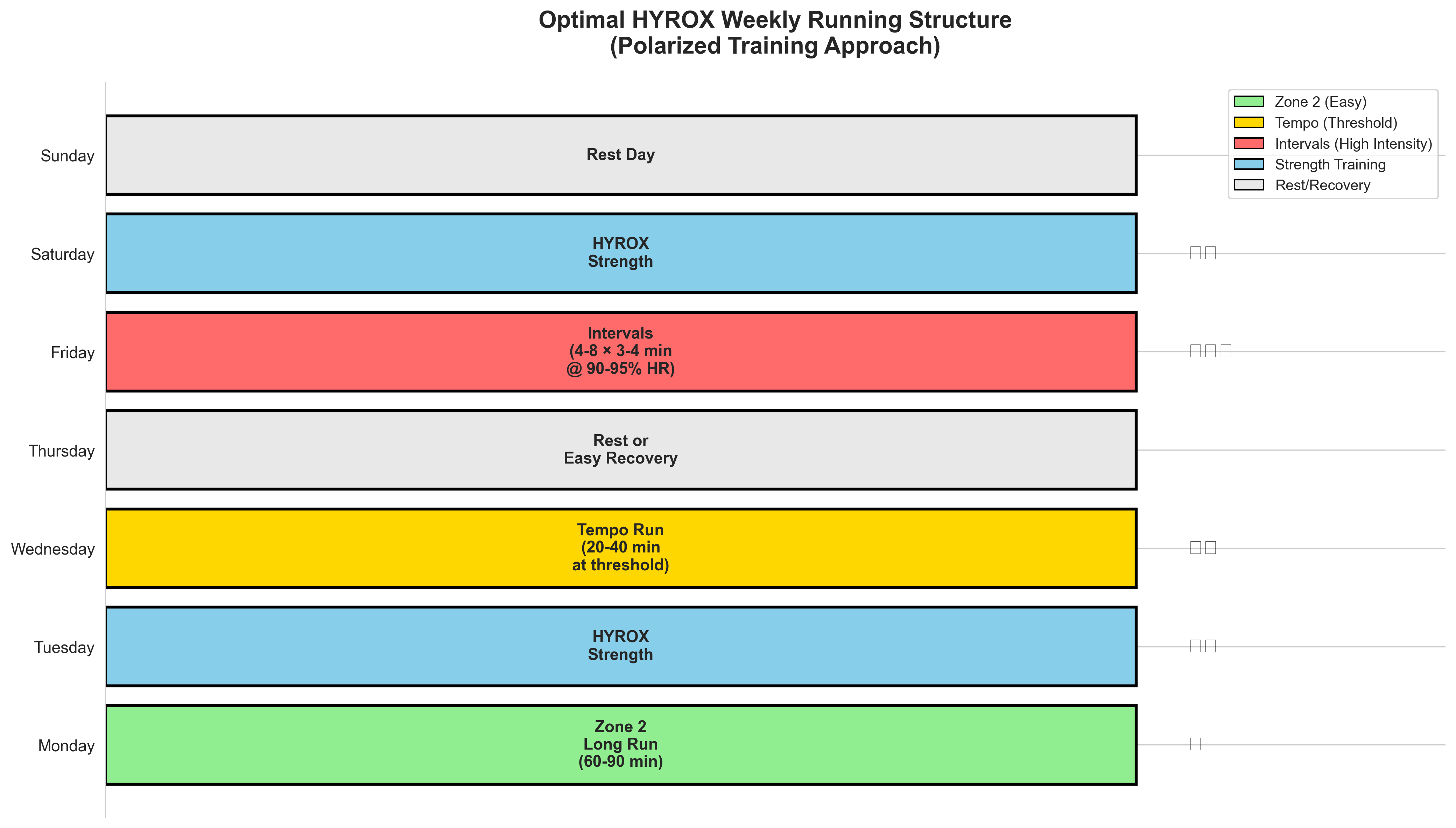 - Total: 4-5 runs/week + 2-3 HYROX sessions